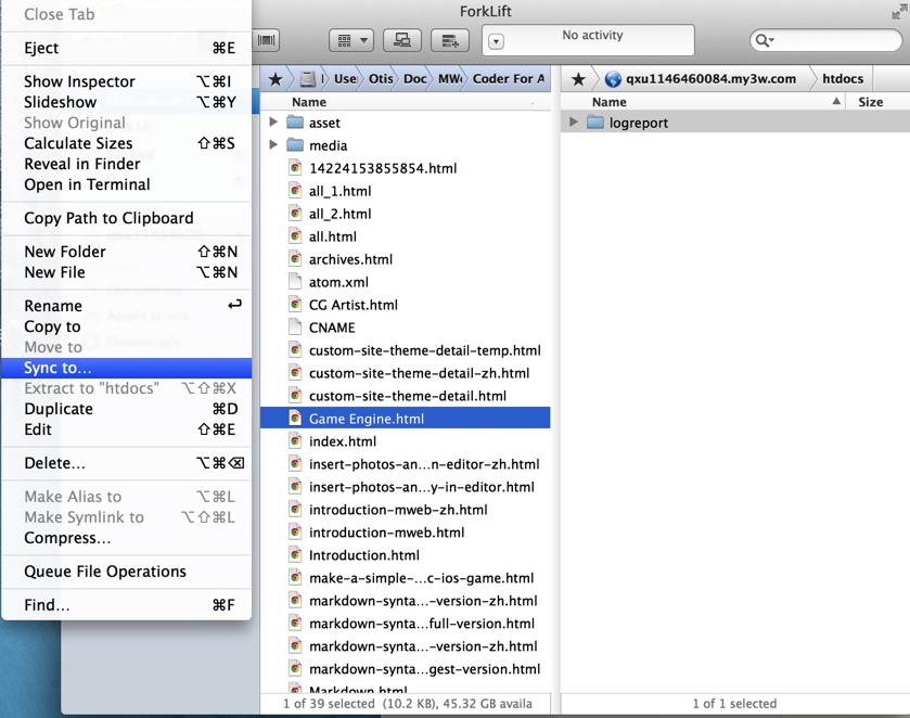 我是用MWeb生成的静态网站并上传试试如何的。下图左边是我本机的用MWeb生成的静态网站的所在文件夹,然后右边是连上所给的FTP后,转到htdocs文件夹,在ForkLift中选择File-->Sync to...