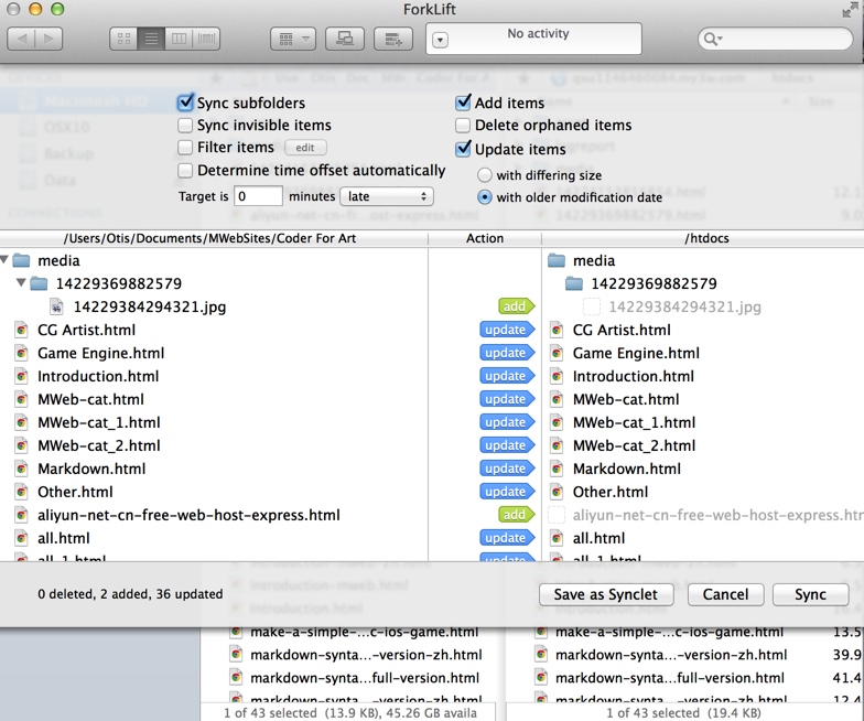 可惜的是:ForkLift不会自动同步,还是要你去点File-->Sync to...才可以。如图,他会找出那些文档有改动,然后点Sync,才会更新到FTP。