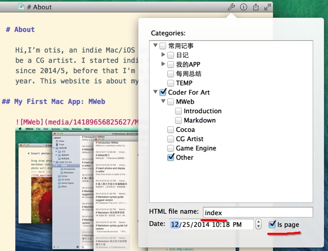 不选Is page选项时,生成HTML时读取的模板为:header.html+post.html+sidebar.html+footer.html。选中了Is page选项后,生成HTML时会读取的模板为:header.html+page.html+footer.html,如果要自定文档的模板,可以在主题文件夹里新增一个名称为:page-{HTML file name}.html 的页面,这样生成HTML时的读取的模板就会变成:header.html+page-{HTML file name}.html+footer.html。比如说要自定首页的模板,则在主题文件夹里新增一个名为:page-index.html 的页面即可。如 http://coderforart.com 就自定了首页,内容为:https://github.com/oulvhai/MWeb-Themes/blob/master/mweb-greyshade/page-index.html