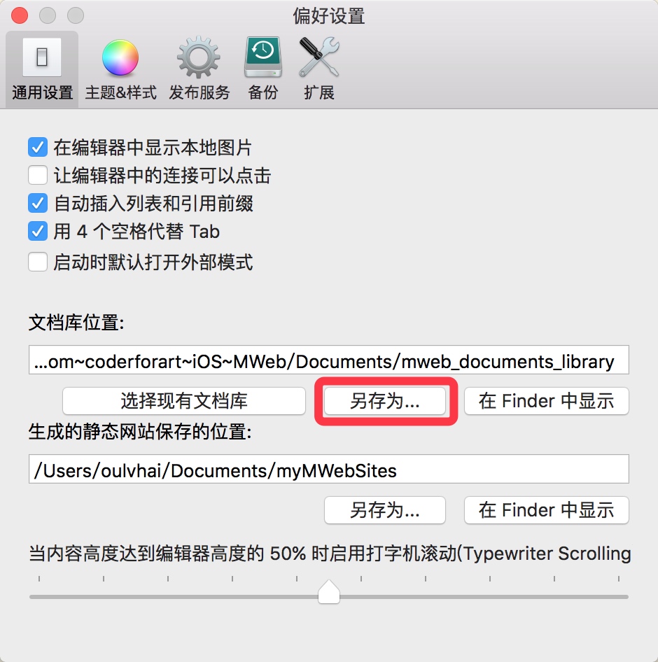 首先打开 MWeb for Mac 的偏好设置 - 通用设置(可以用 CMD + , 快捷),在通用设置 - 文档库位置中,点 “另存为...” 按钮,把文档库位置移到 iCloud Drive 的 MWeb 所属的文件夹内或者是 Dropbox 中,如下图我是放到 iCloud Drive 中的 MWeb 文件夹内的 mweb_documents_library 文件夹中。如果在你的 Mac 的 iCloud Drive 中看不到 MWeb 所属的文件夹,可以试试在 iOS 的 系统设置 - iCloud - 关闭 iCloud Drive,然后再重新打开。如果等一段时间后还是无法看到,建议使用 Dropbox。😄