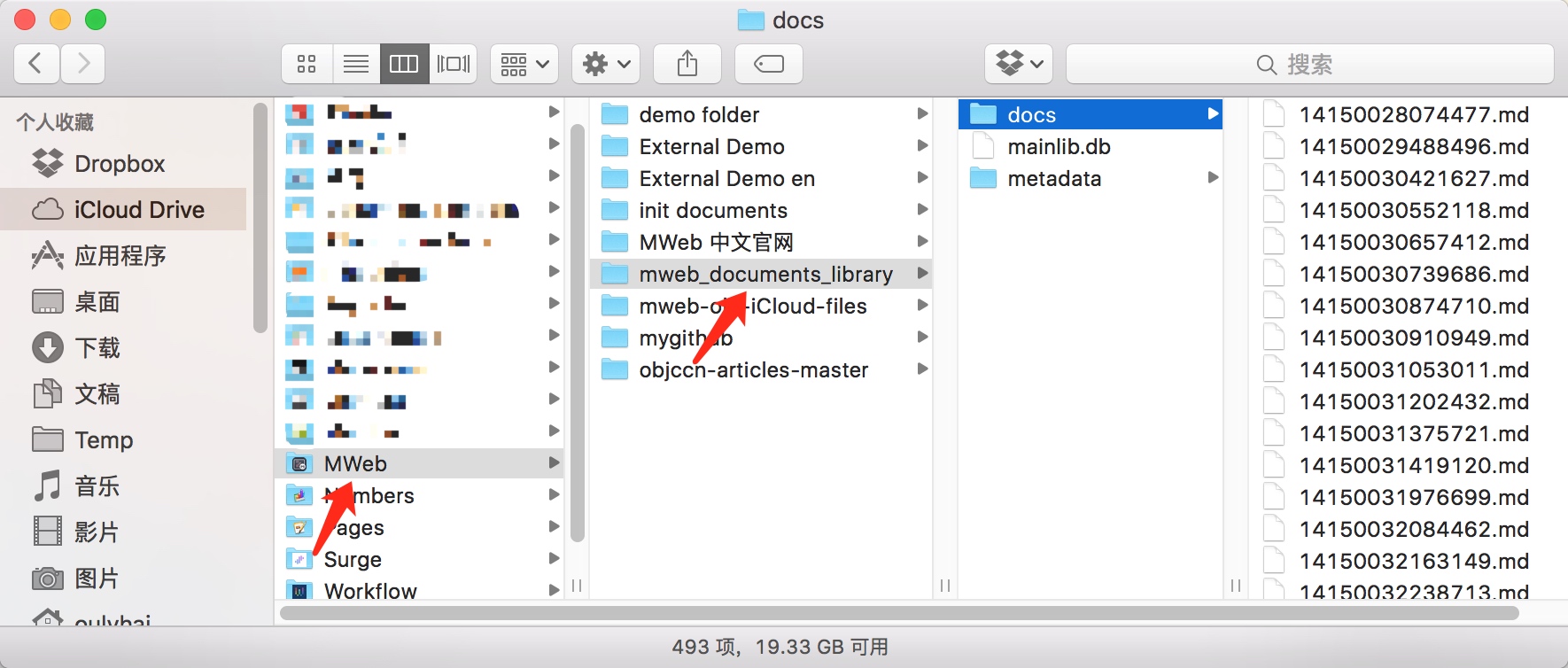 这时 iCloud Drive 中的文档库的文件结构如下图所示,可以看出 MWeb 文档库的文件夹内会有一个名为 docs 的文件夹和一个名为 mainlib.db 的文件,docs 文件夹内会有所有的笔记文档。MWeb 的文档库就是由 docs 文件夹,mainlib.db 文件以及可能存在的 metadata 文件夹构成的。