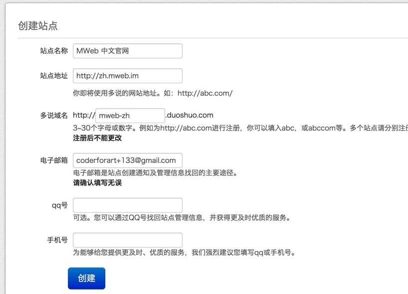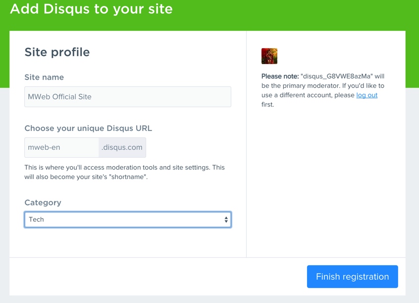 打开 https://disqus.com/ 注册并登入后,点 Add Disqus To Site 填入博客信息,我是这样填: