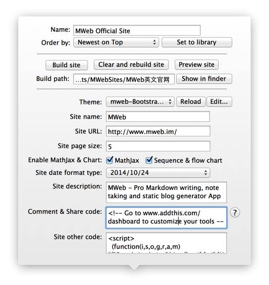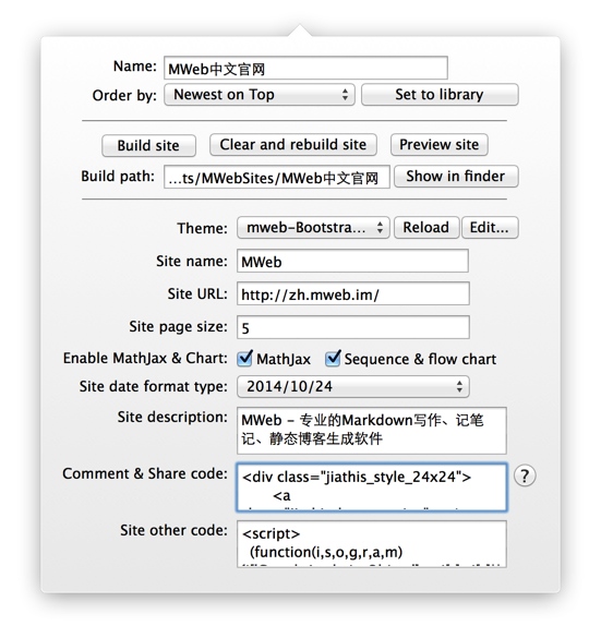 然后把分享代码放上边,评论代码在下边,一起加起来贴到 MWeb 的分类设置的 Comment & Share code 输入框中。大概是像下面这样,这也是 MWeb 中文官网的分享和评论所用的代码。