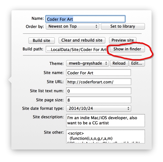 这样就简单了,先进入MWeb生成的网站的所在文件夹(如上面所说,在MWeb中点Show in finder),我这里是选择 Coder For Art 然后 CMD+C。如图: