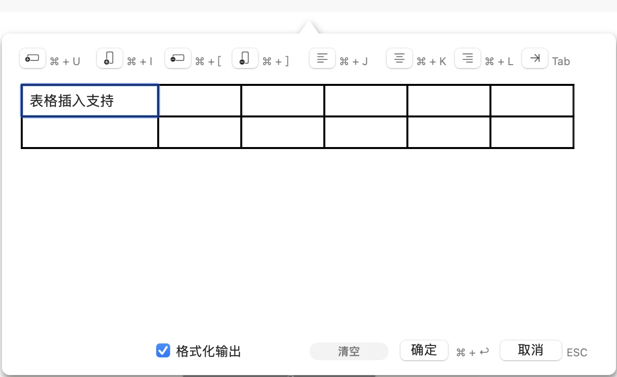 你可以按工具栏上的插入表格按钮来插入表格,也可以用快捷键 Ctrl + Shift + T,如下图为 macOS 上的表格插入支持,iPadOS/iOS 上也有此功能: