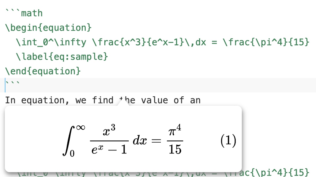 在 MWeb 编辑器中,光标移到 LaTeX中间,即可以预览 LaTeX 公式,如果修改公式,预览也会实时更新,如下图为 LaTeX 公式的辅助,mermaid,echarts 的辅助也是一样效果: